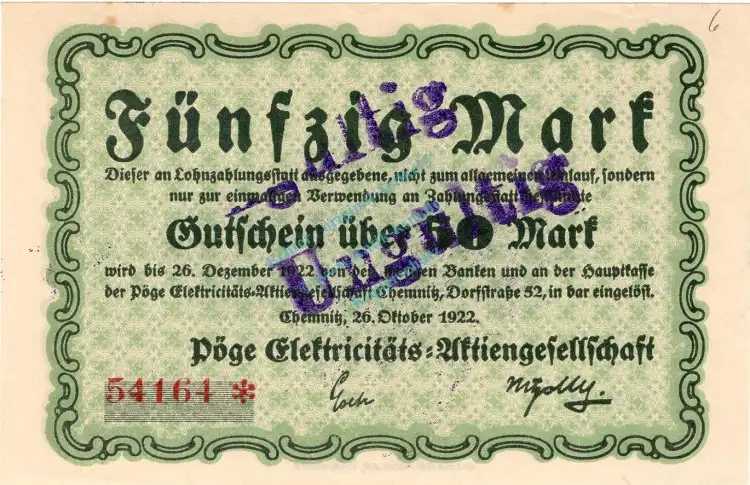 Chemnitz , Banknote 50 Mark Schein unc-kfr.E Müller 785.9 , Sachsen 1922 Inflation 1922-23