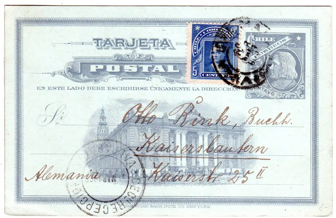 Chile 1909, Columbus 5 C. auf 5 C. Ganzsache v. Valparaiso n. Kaiserslautern