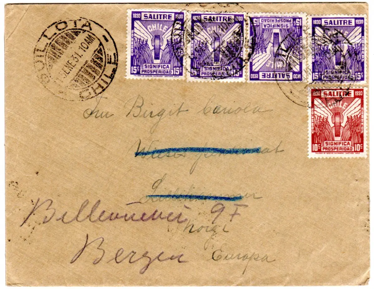 Chile 1931, 10+4x15 C. Salpeter auf Brief v. Quillota n. Norwegen