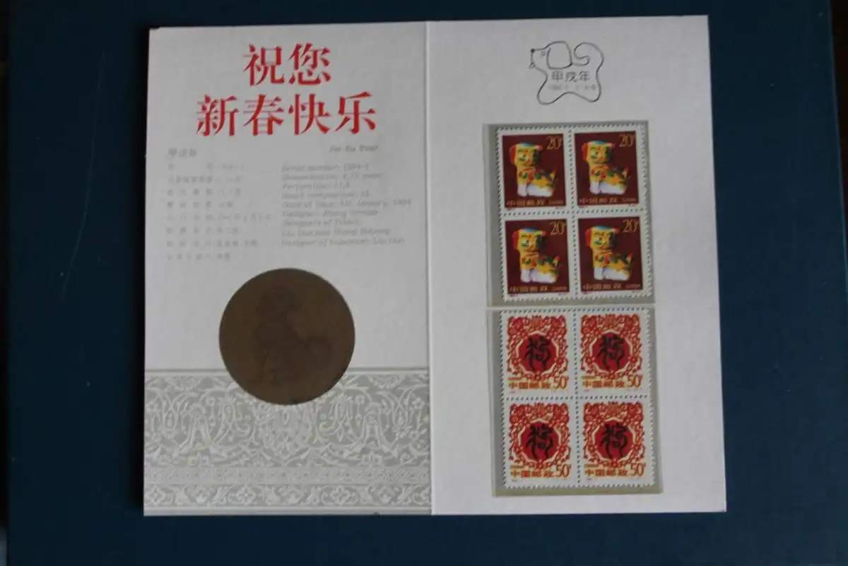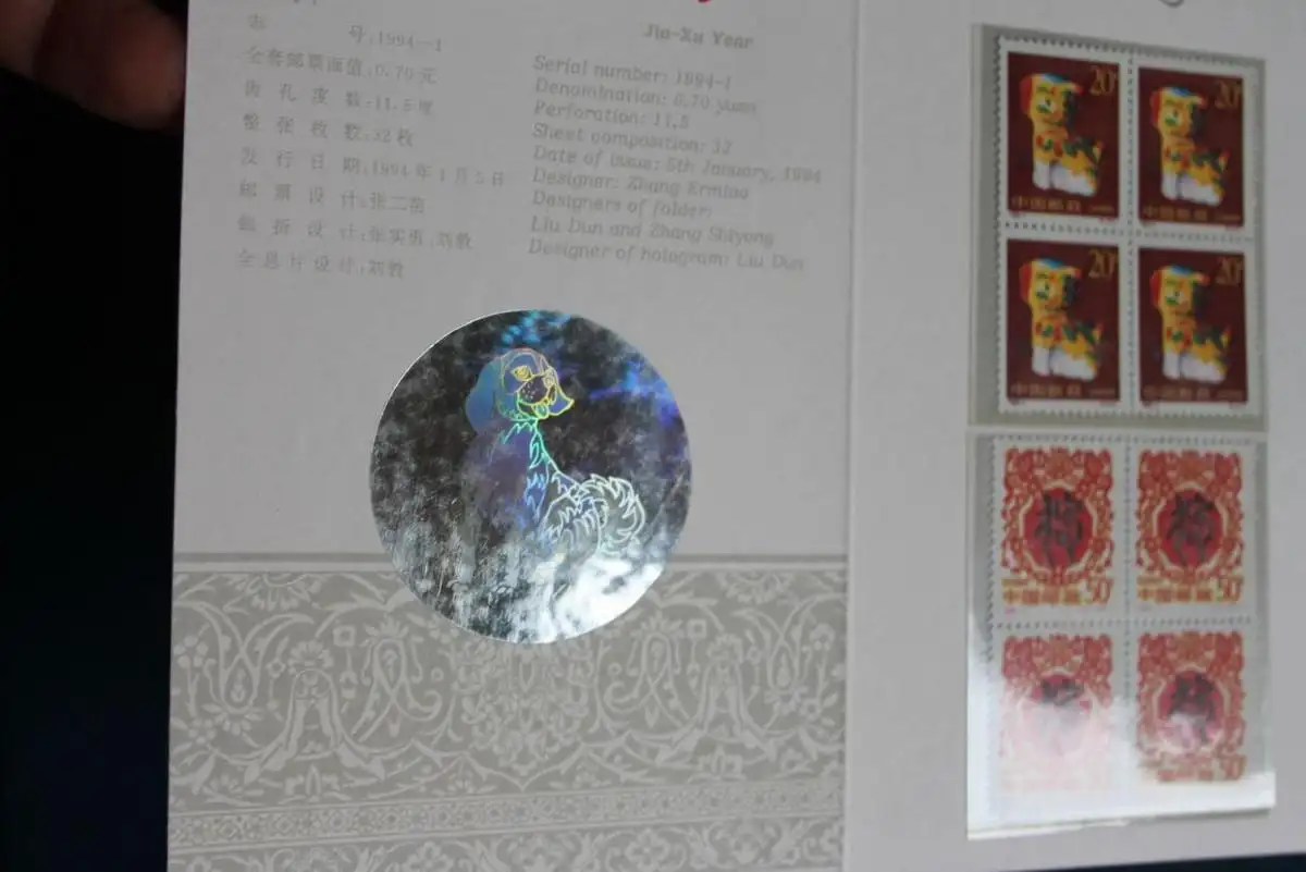 China, 1994 Hologramm Jahr des Hundes, mit 2 Viererblöcken zum Anlaß