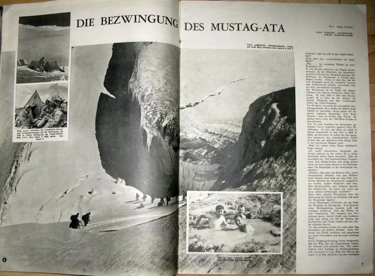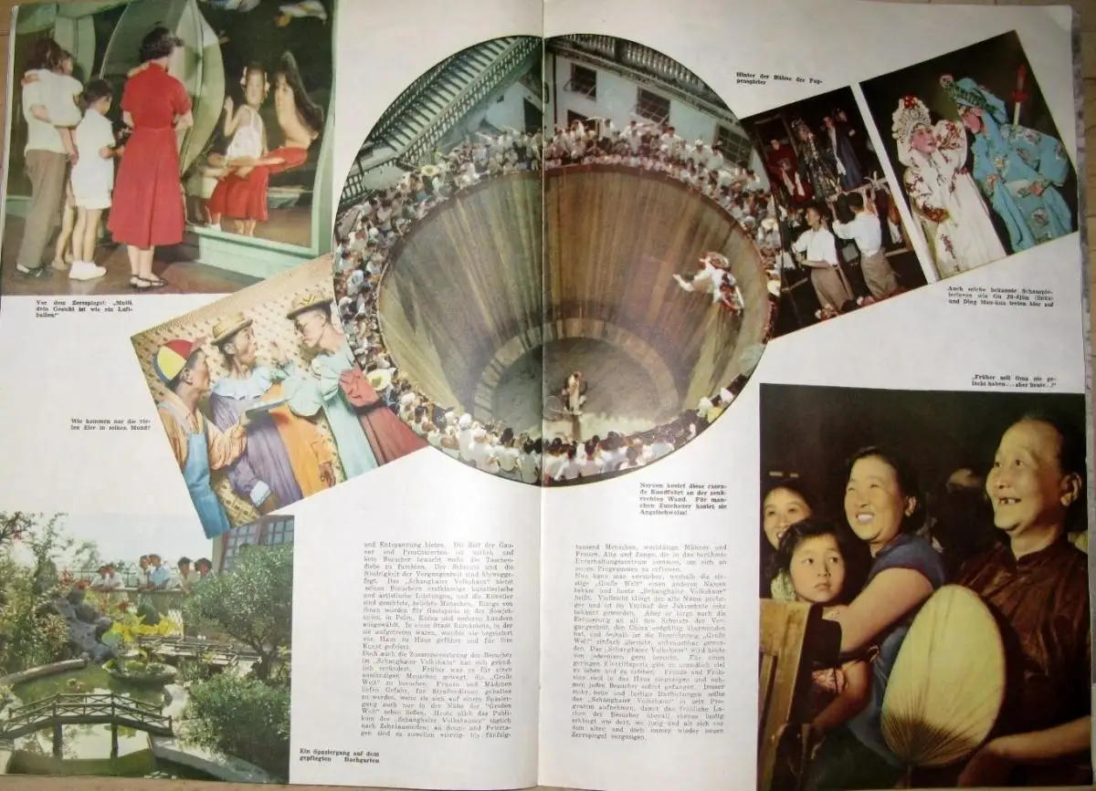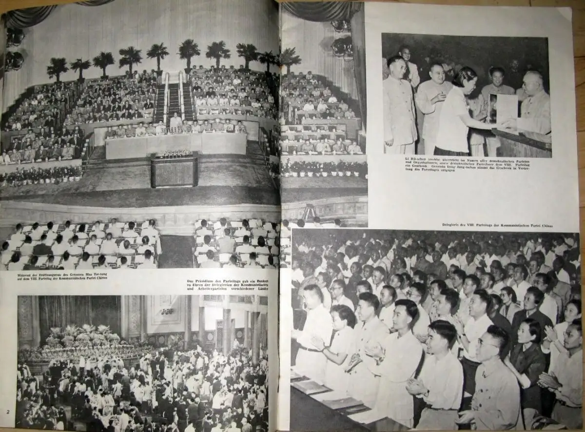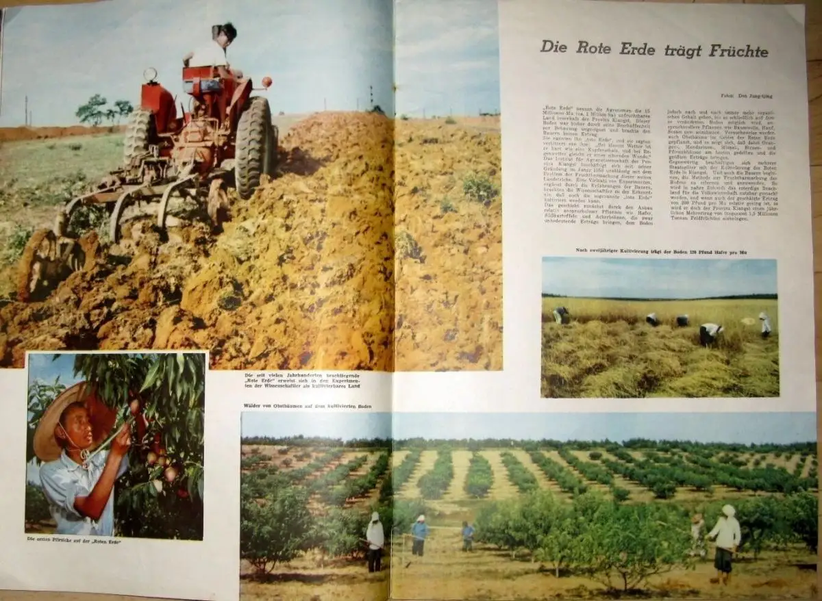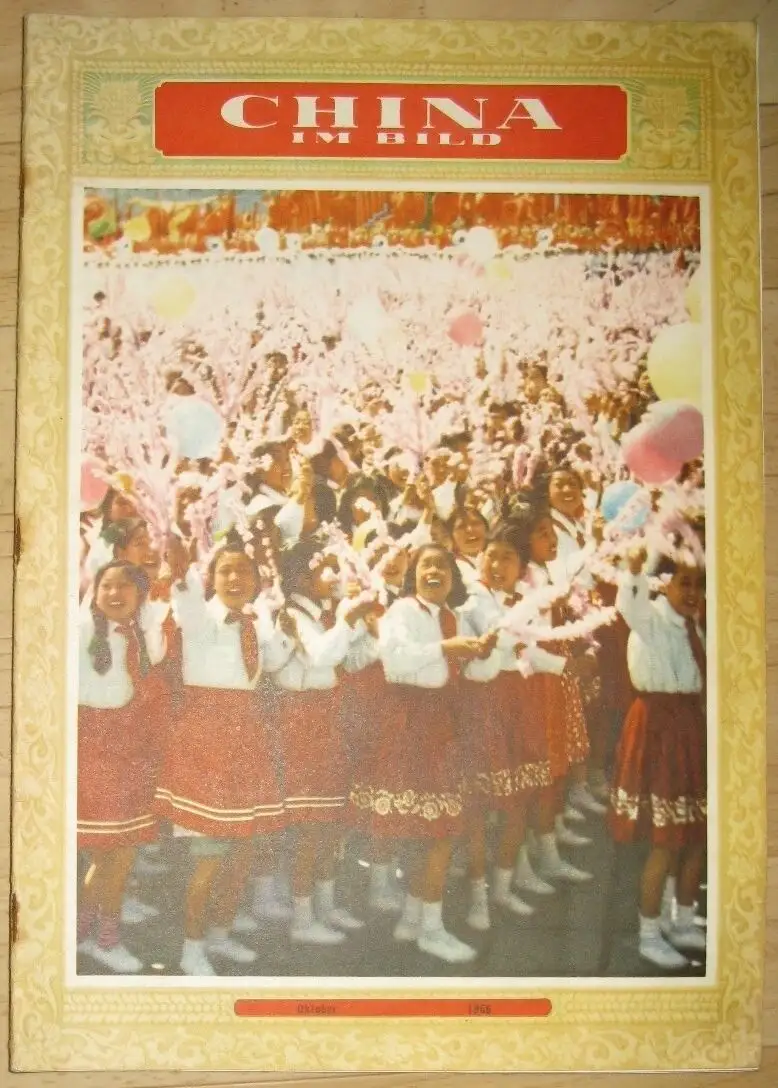 guter Zustand, geringe Gebrauchs- und Alterungsspuren: Klammerrost - Seiten überwiegend sauber und ordentlich - Umschlag und Seiten teils etwas eselsohrig, Der VIII. Parteitag der KP Chinas - China gedenkt Lu Hsüns - Die Bezwingung des Mustag-ata - Die Rote Erde trägt Früchte - „Fische" — Tuschzeichnung - In der Steppe - „Sitzung" am Telefon - Zement - Das O-Meh-Gebirge - Das gebändigte Gas - Pagoden - Malereien aus der Sammlung des Präsidenten - Sukarno - Für die schöne Jün-jüan geschrieben! - Was einmal die „Große Welt" war - Kunstwerke aus Elfenbein - Drei Generationen Lokomotivführer - Auf in die Westberge! - Neues im Bild - Chinas ABC-Schützen - Sport, kartoniert, ca. 26 x 37, 40 Seiten mit zahlreichen Bildern