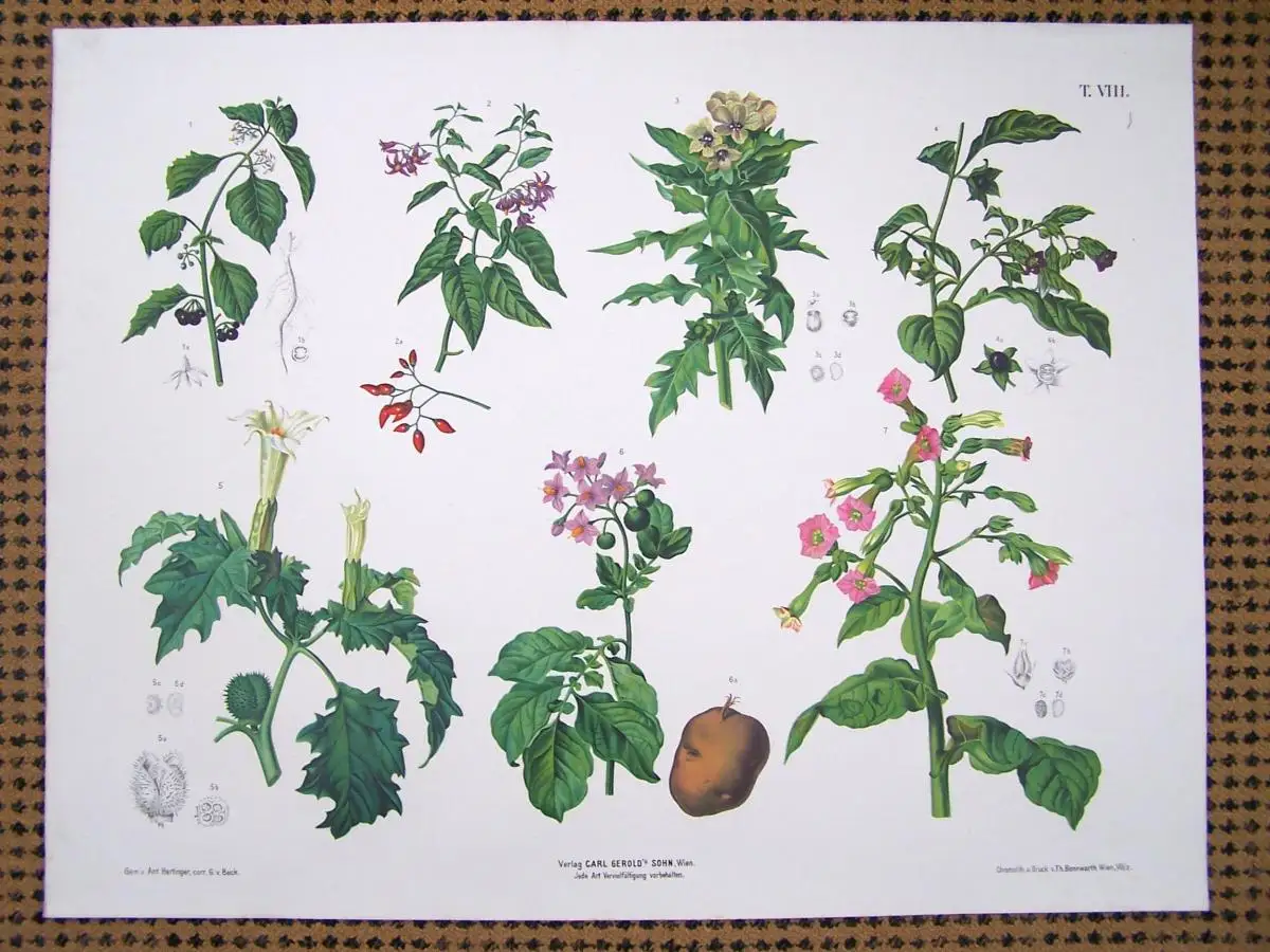 Kontraststarke und farblich prächtige Blumen gezeichnet für den Naturgeschichtlichten Anschauungsunterricht (Format: 84 x 64cm). Die verschiedenen Pflanzen bilden die achte botanische Schulwandtafel von "Hartinger's Wandtafel", in der eine Reihe von botanischen und zoologischen Objekten zumeist aus 8 oder 10 farbigen Chromolithographien gefertigt wurden. Während bei den älteren Tafeln die Farben rein deckend oder mit Spritzmanier in Farbmischung erschienen, sind bei den unter dem Einfluss des Jugendstils entstandenen Tafeln verschiedene Tangiermanieren angewendet worden, die den Farbflächen unterschiedliche Punkt- oder Strichraster verleihen. Nur wenige Tafeln wurden in farbiger Autotypie gedruckt.