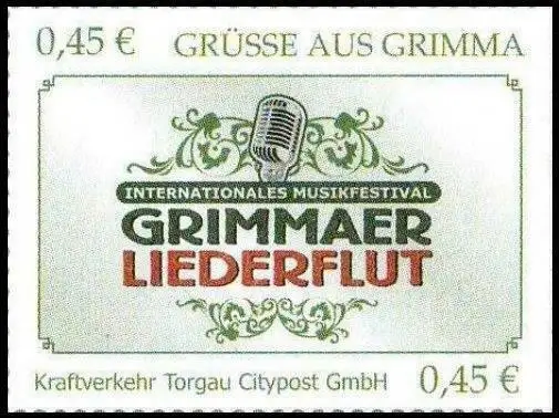 • MichSeite Kraftverkehr Torgau Citypost: MiNr. 14, 21.07.2009, "Grimmaer Liederflut", Satz, postfrisch Beschreibung \nAusgabeland: Bundesrepublik Deutschland \nPostdienstleister: Kraftverkehr Torgau Citypost, Torgau \nAusgabeanlass: Briefmarkenausgabe "Grimmaer Liederflut" Katalognummer: MiNr. 14 Ausgabedatum: 21.07.2009 Nominale: Satz (1 Wert) zu 0,45 EUR \nTyp: - \nErhaltung: selbstklebend, gerade gestanzt, postfrisch \nHinweis: -