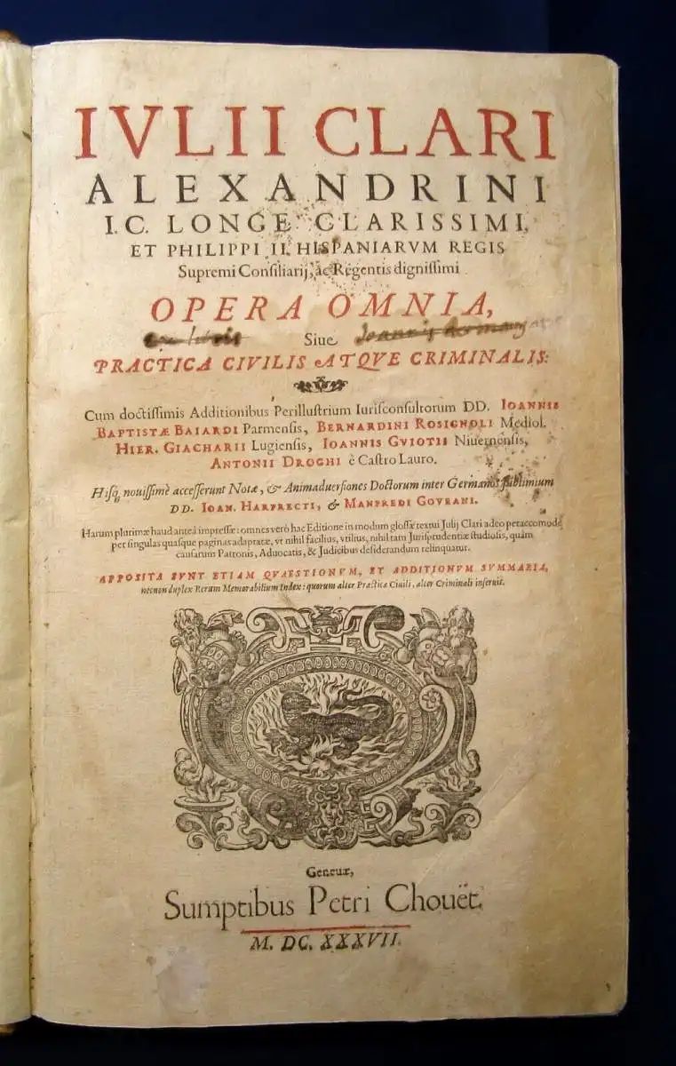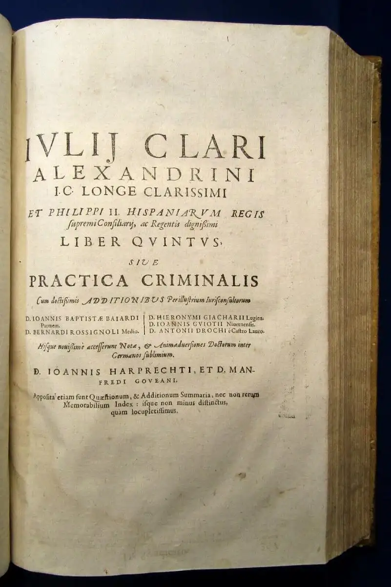 Übersetzung des Titels: Julius Clari Alexandrini I.C. Der mit Abstand berühmteste und Philipp II. Alle Werke des Obersten Rats des Königs von Spanien und des würdigsten Regenten: oder Zivil- und Strafpraxis.
