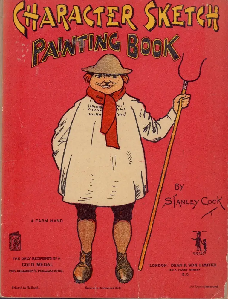 Malbuch mit karikierten typischen englischen Figuren: A farm hand, a beefeater, a hawker of air balloons, a Jolly Jack tar, a typical Paddy, the amateur minstrel, an enthusiastic golfer. - "Printed in Holland. The only recipients of a gold medal for children's publications" (VDeckel). - Farbige Vorlagen u. Seiten zum Ausmalen. Stanley Cock, britischer Karikaturist, Kinderbuch- u. Postkarten-Illustrator, tätig Anfang des 20. Jahrhunderts. - Einband leicht bestoßen, durchschossenes Exemplar, 3 Bilder von Hand säuberlich ausgemalt, Name auf RDeckel (Laetitia Gossler - evtl. Wilhelmine Laetitia Gossler, geb. 1890?). - Sauberes Exemplar