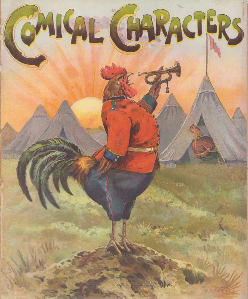 Comical Characters merry, Comical Characters gay, Kittens and Cats, And Puppies in hats, And Bunnykins all at play!. Das Deckelbild zeigt einen Fanfare blasenden Hahn in Uniform; es gibt singende Hunde u. Katzen mit Liederbüchern u. viele weitere "vermenschlichte" Tiere. - Rücken durchgeh. beschabt, Papier gebräunt, Bll. mit kl. Randläsuren, unt. RDeckel-Ecke geknicht. - Selten