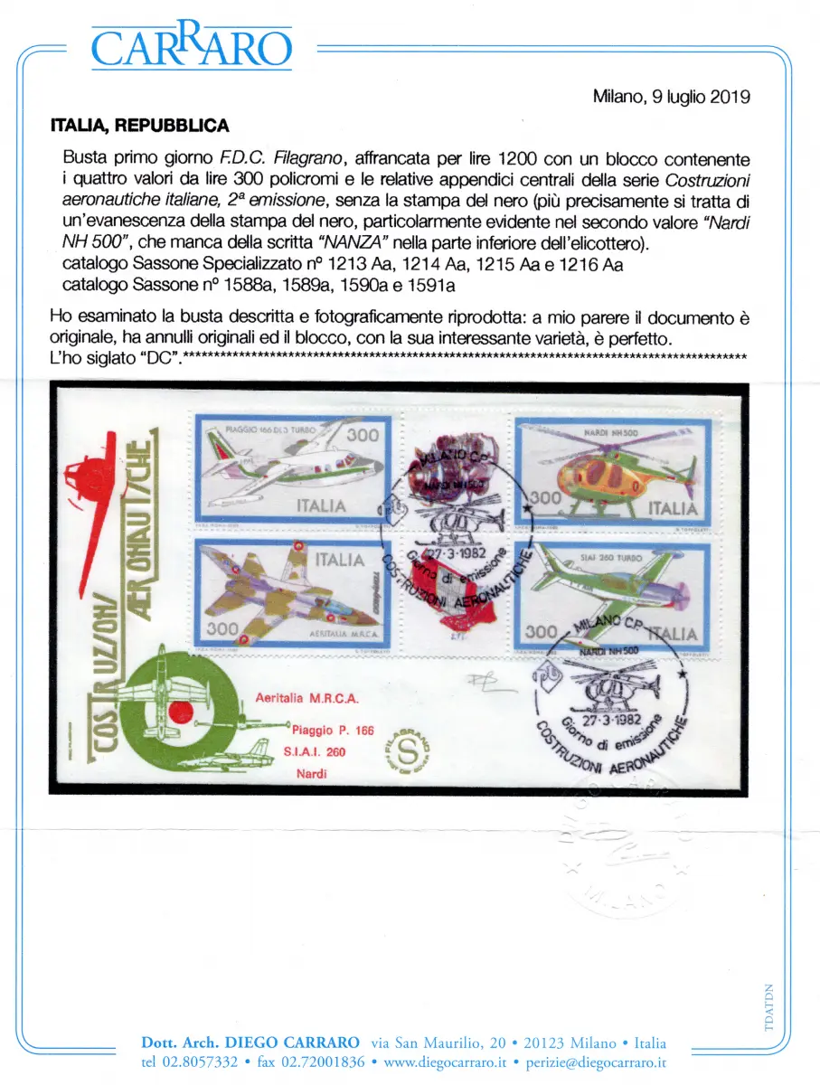 Luftfahrtkonstruktionen '82 Sorten auf Umschlag FDC Umschlag - Luftfahrtkonstruktionen '82 Nr. 1588a/1591a die Blockserie mit Anhängen in der Mitte, mit Sorte ohne Schwarzdruck auf FDC Filagrano Umschlag - Selten - Zert. Carraro - Angebot als gebraucht Kat. euro 800 Cod. 657/15