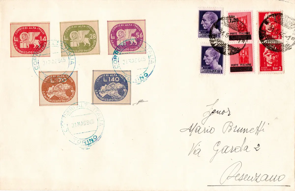 BÜSTE - Coralit - Löwe von San Marco Nr. 3/7 komplette Serie auf Umschlag (philatelistisch) von Turin nach Desenzano am 31.5.45 - auf der Rückseite Ann. und Angabe des Kuriers - Cert. RD - Kat. euro 1.650 Cod.398/182