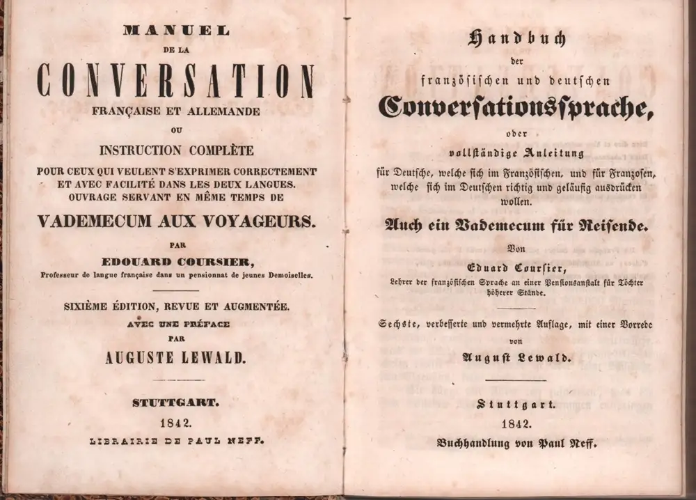 Titel: Handbuch der französischen und deutschen Conversationssprache, oder vollständige Anleitung für Deutsche, welche sich im Französischen, und für Franzosen, welche sich im Deutschen richtig und geläufig ausdrücken wollen. Auch ein Vademecum für Reisende. 6., verbess. u. vermehrte Aufl., mit einer Vorrede von August Lewald