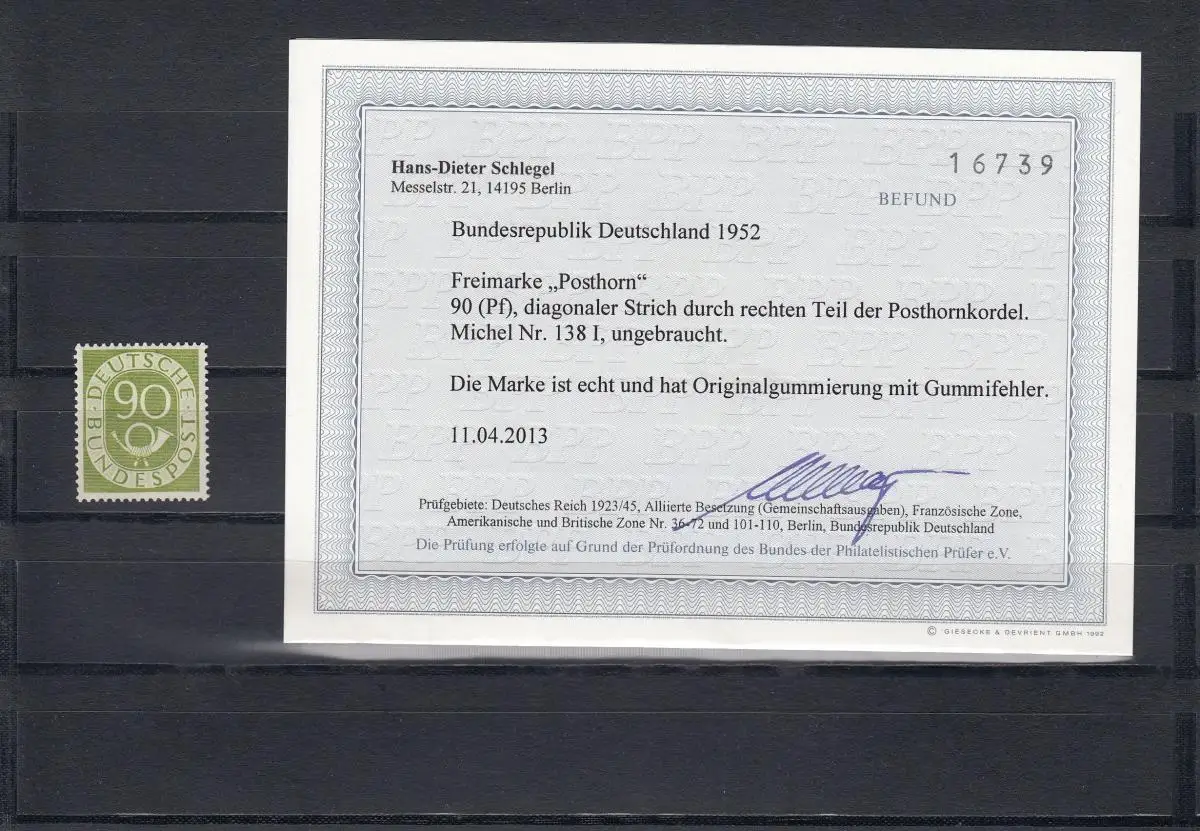 Couvercle: MiNr. 138 I, Posthorn, défauts de plaque, minuscule erreur de caoutchouc, résultat BPP