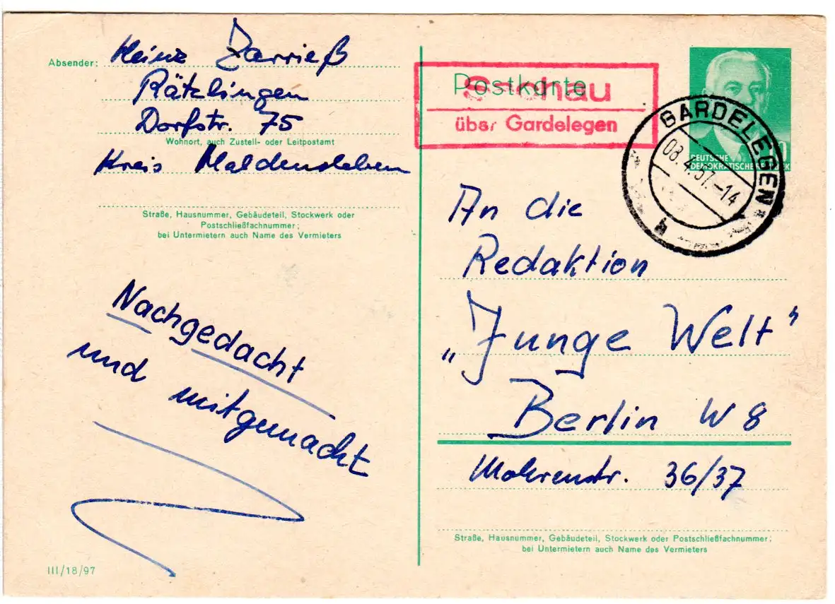 DDR 1957, roter (!) Landpost Stpl. SACHAU über Gardelegen auf 10 Pf. Ganzsache