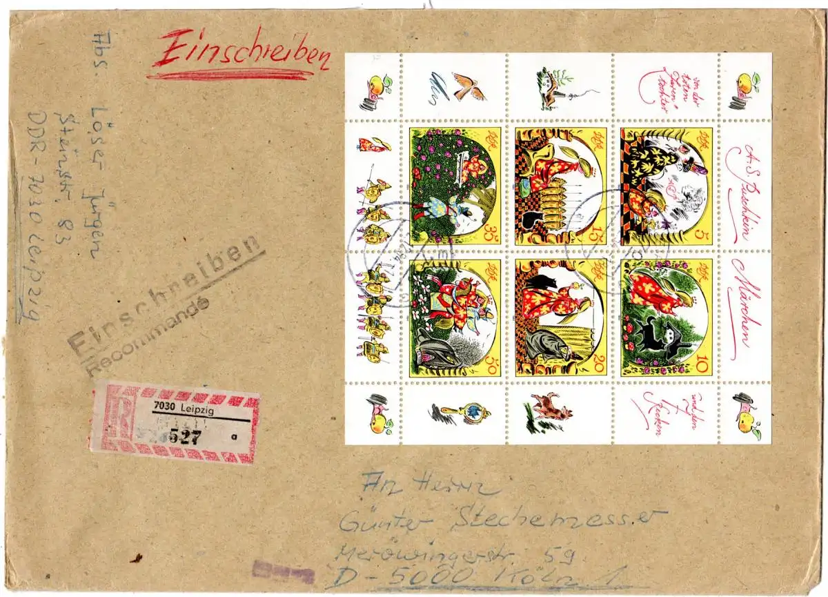 DDR 1984, Puschkin Märchen Kleinbogen auf Reko Brief v. Leipzig n. Köln.