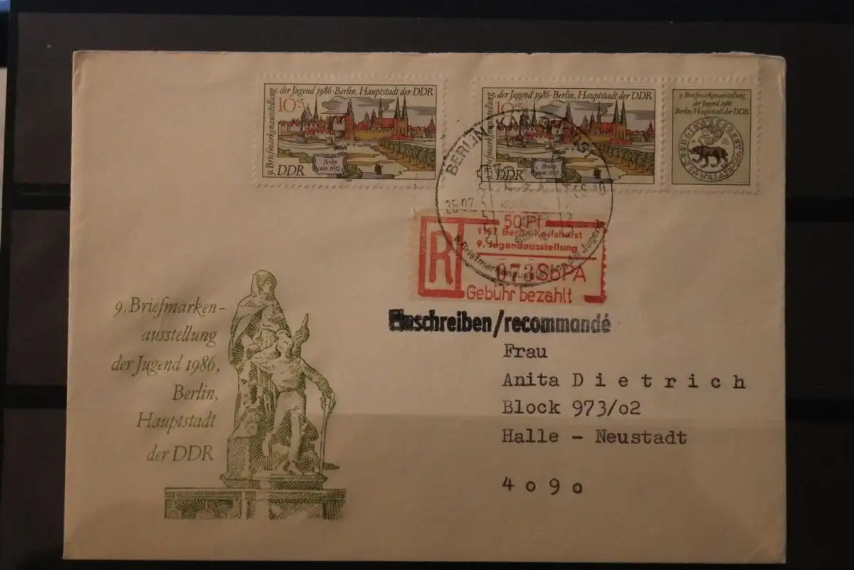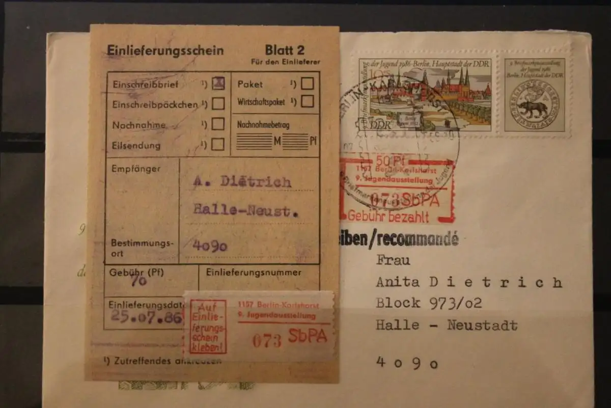 DDR 1986, R-Brief mit Sonder-Einschreibezettel: 9. Jugendausstellung Berlin-Karlshorst