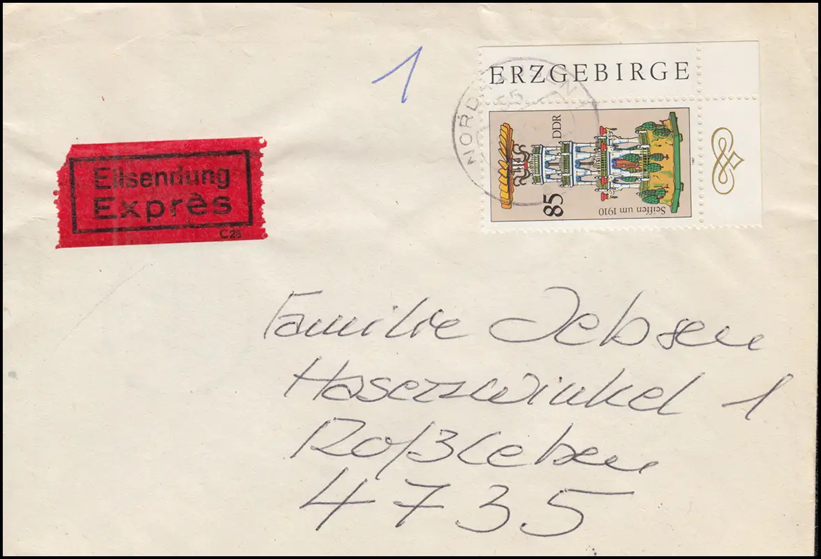 DDR 3139 Pyramide de Noël 85 Pf sur lettre d'urgence, Maison du Nord 10.3.88 n. ROSSLEBEN