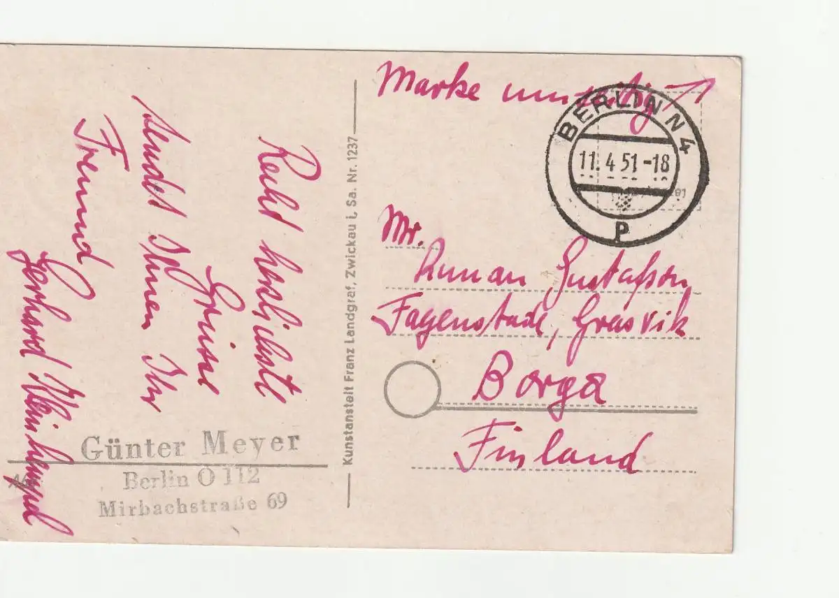DDR: Ans.-karte nach Finnland mit Messemarke 1951
