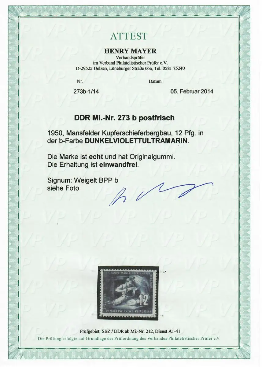 DDR MiNr. 273b, post-fraîchissement, **, BPP Signature