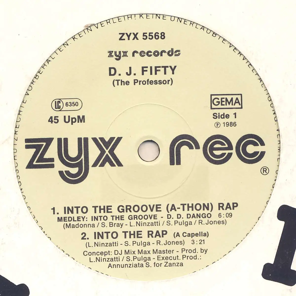 12" Maxi DJ Fifty Le Professeur - Into The Groove A-Thon Rap, Recover de la société de disques; Luciano Ninzatti, Stefano Pulga / Madonna coverversion, État Platte VG+ Hülle VD+; Made in Germany 1986 ZYX Records 5568, Tracks InTO The Groové 6:09, In to The Rap [A. Cappella] 3:21, D. Dango 3:59, Into The rap [Instr] 3:22