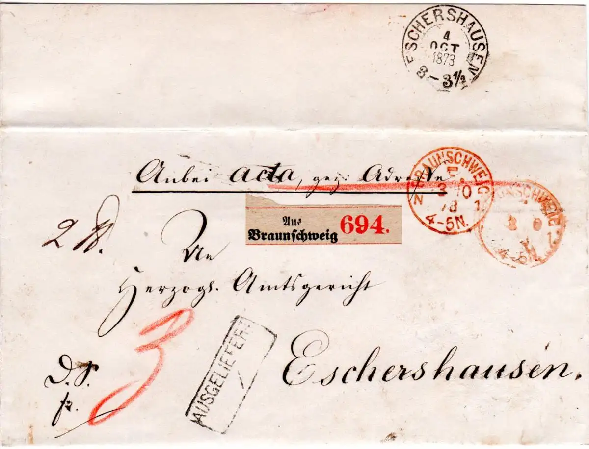 DR 1873, roter Franko-Stpl. Braunschweig F. N1 auf Paket Brief n. Eschershausen