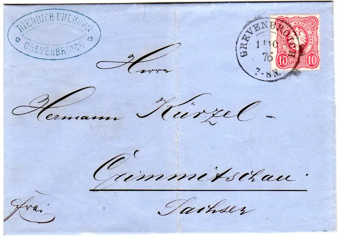 DR 1876, K2 GREVENBROICH klar auf Firmenbrief m. 10 Pfge.