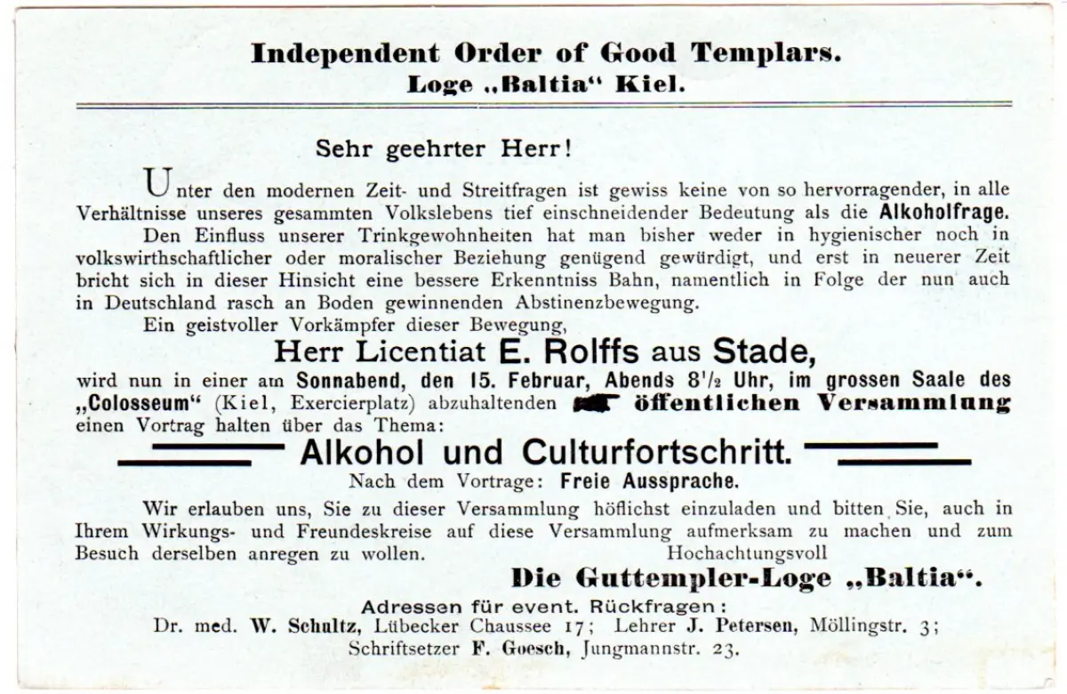 Ganzsache m. rückseitigem Zudruck der Guttempler-Loge "Baltia" betr. Einladung zu einem Vortrag ALKOHOL u. CULTURFORTSCHRITT von E. Rolffs aus Stade.