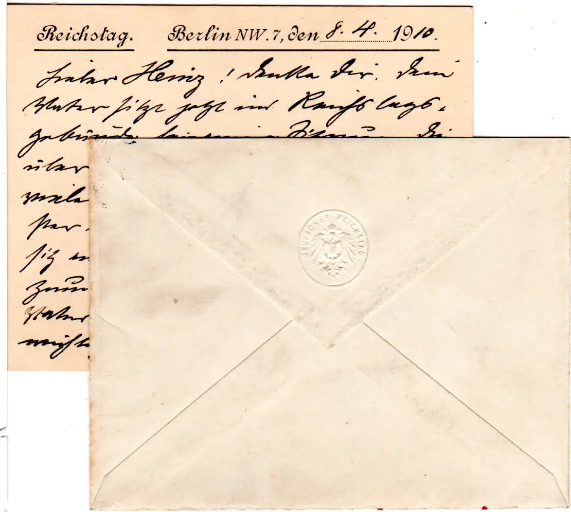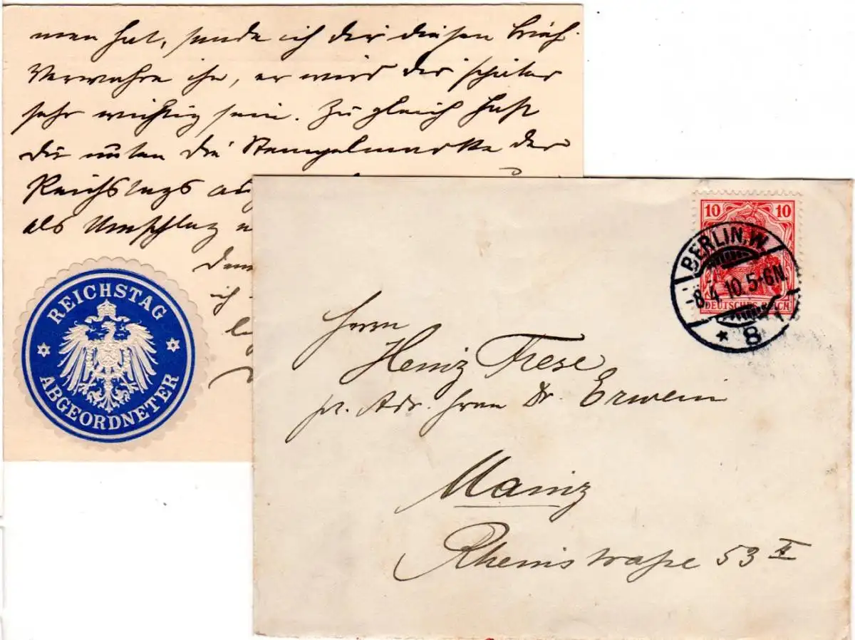 Offizielle Karte Reichstag Berlin m. blauem Präge-Etikett REICHSTAG ABGEORDNETER m. zugehörigem Umschlag m. rücks. Prägung Deutscher Reichstag. Mit 10 Pf. Germania v. Berlin n. Mainz.