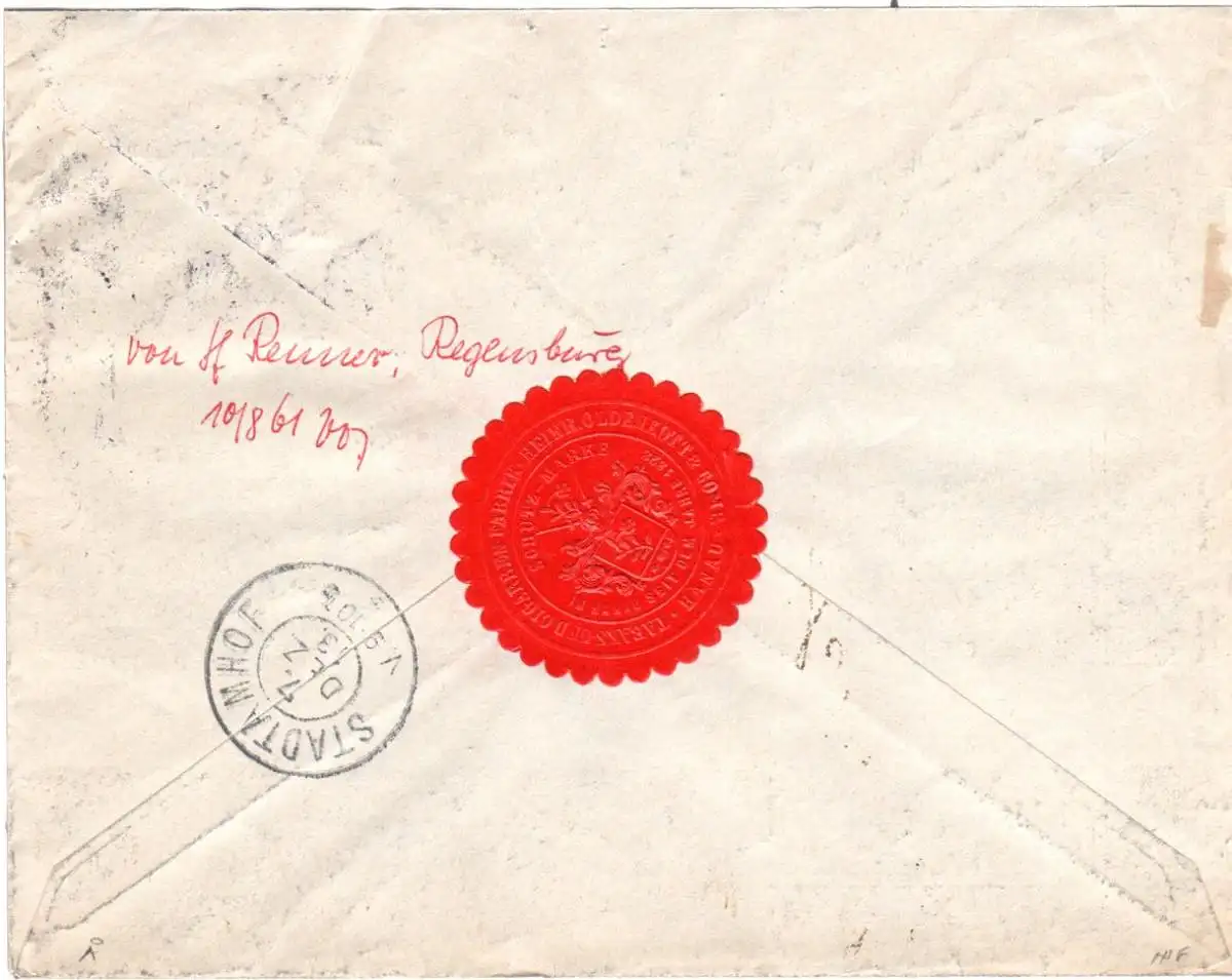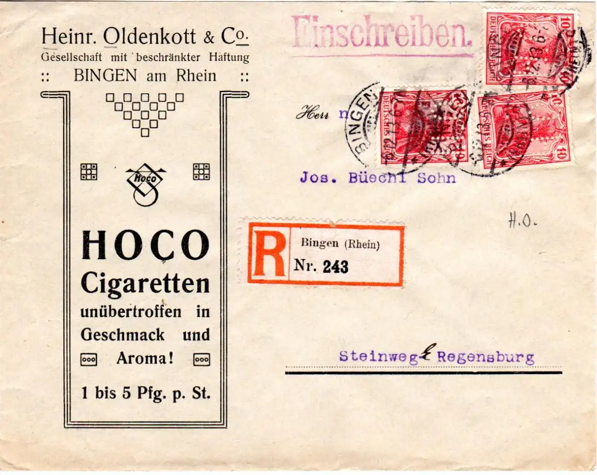 3x10 Pf. m. Firmenlochung H.O. auf attraktivem HOCO Zigaretten Brief n. Regensburg. Rückseitiger Briefverschluss m. schönem rotem Siegeletikett