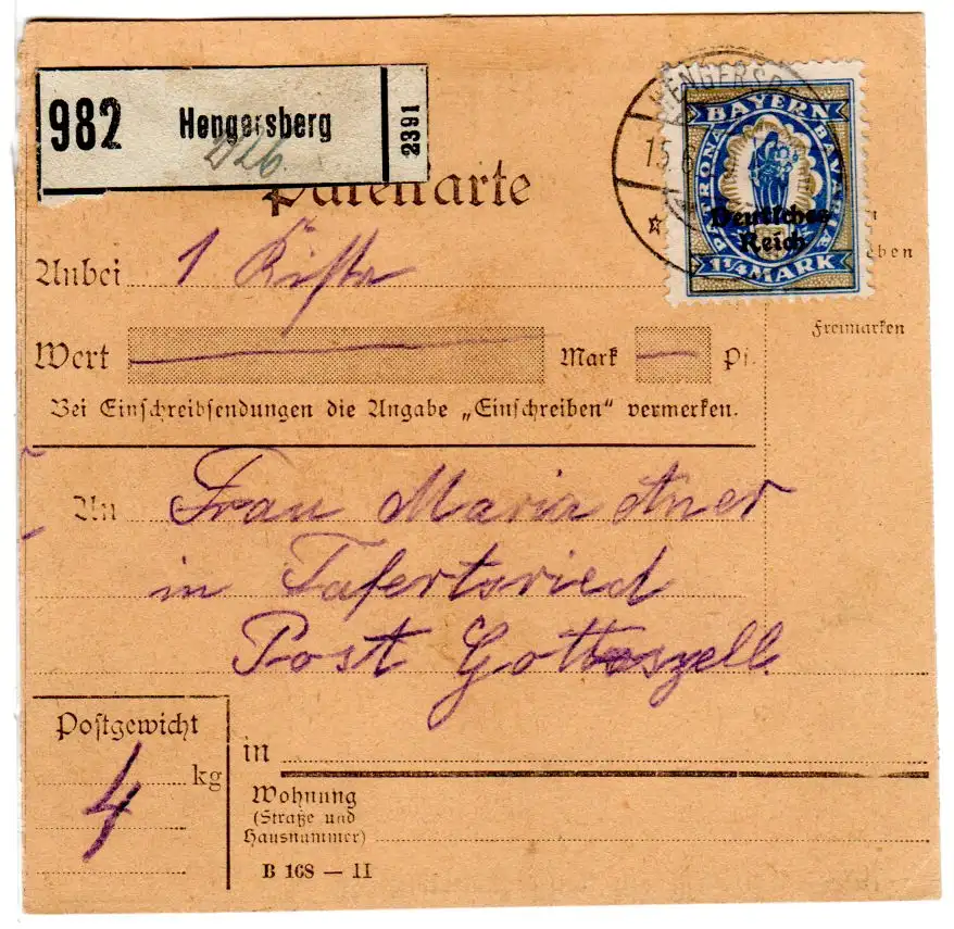DR 1920, 1 1/4 Mk. Bayern Abschied auf Paketkarte v. Hengersberg n. Tafertsried