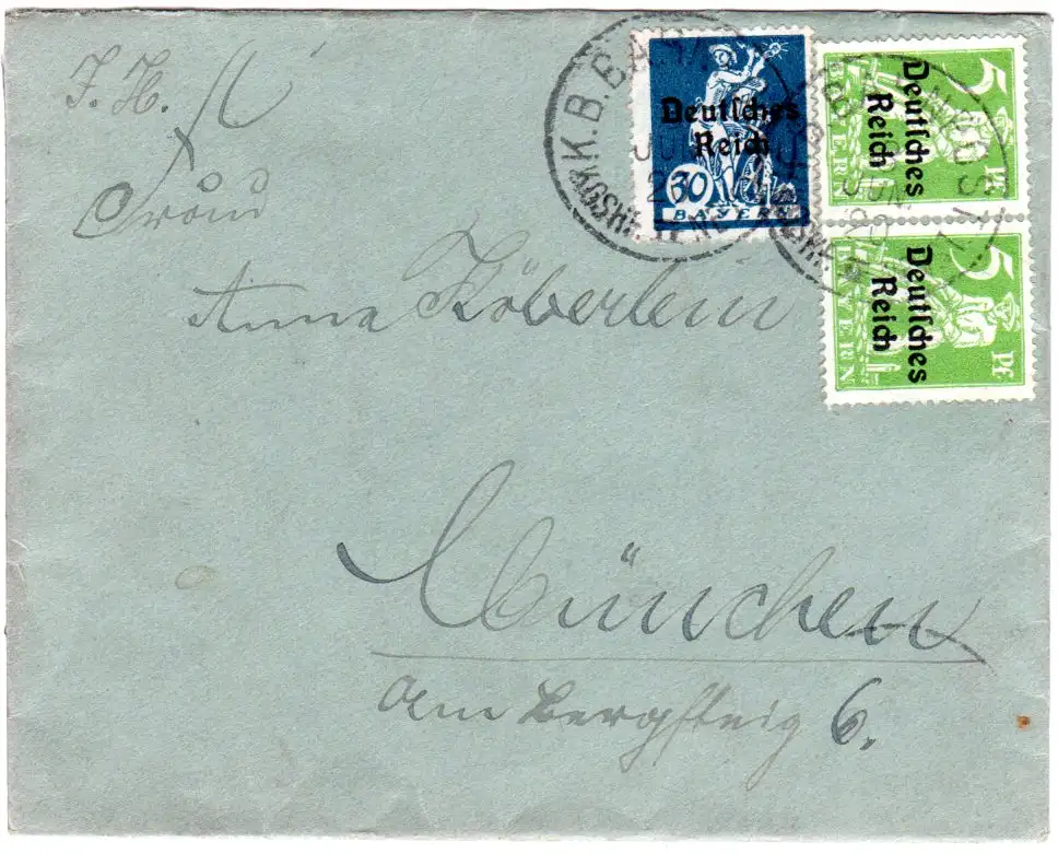DR 1920, 30+2x5 Pf. Bayern Abschied auf Brief m. K.B. Bahnpost KGSHF II NEUST