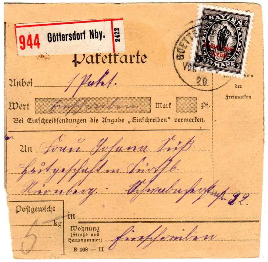 DR 1920, EF 2 1/2 Mk. Bayern Abschied auf Einschreiben Paketkarte v. Göttersdorf