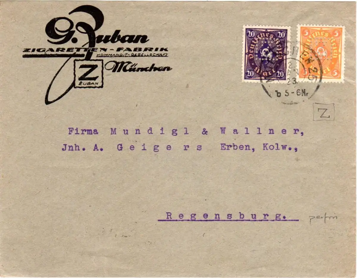 5+20 Mk. m. Firmenlochung Z im Rahmen auf Zuban Zigaretten-Fabrik Brief n. Regensburg.