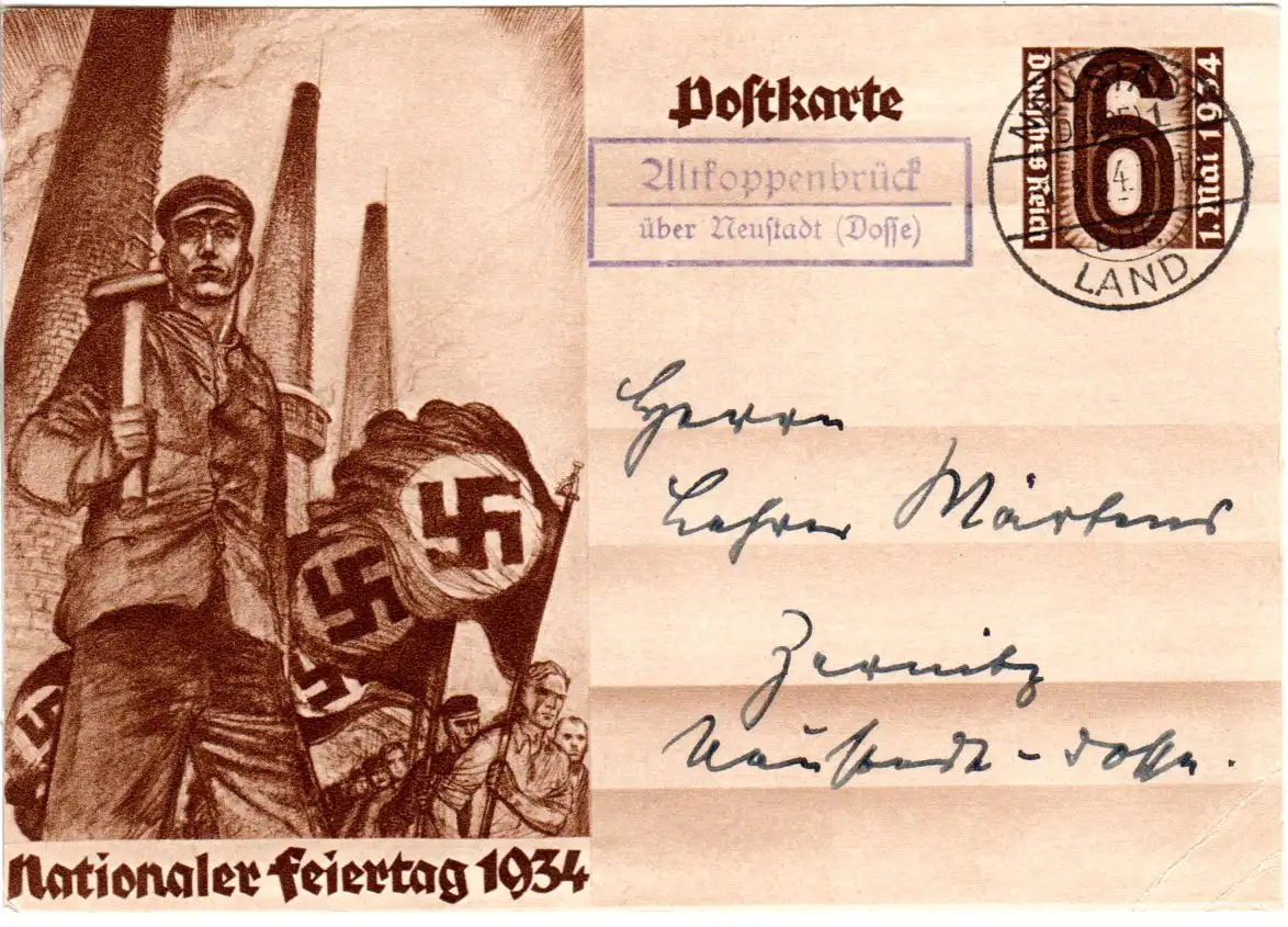 DR 1934, Landpost Stpl. ALTKOPPENBRÜCK über Neustadt (Dosse) auf 6 Pf. Ganzsache