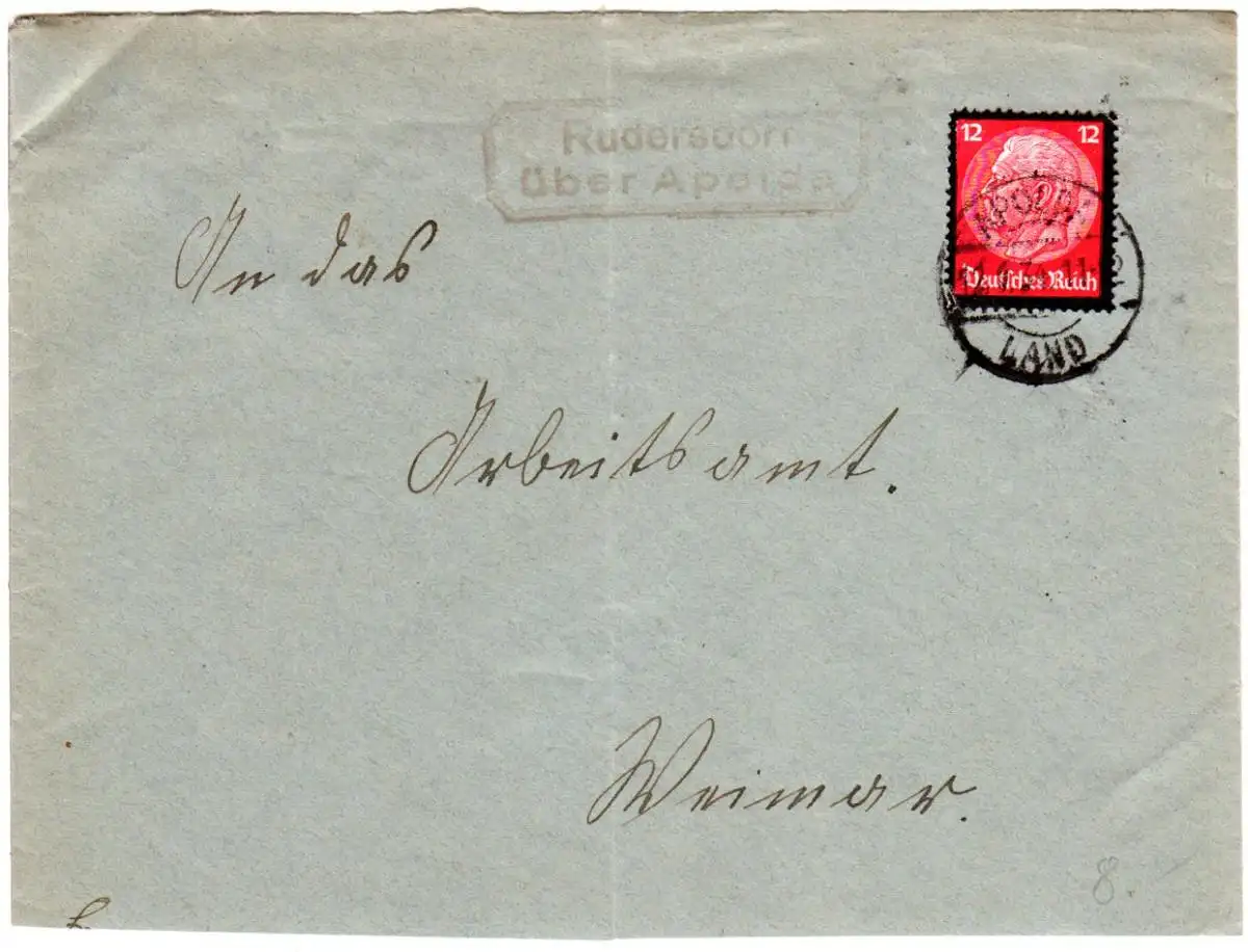 DR 1934, Landpost Stpl. RUDERSDORF über Apolda auf Brief m. 12 Pfg.