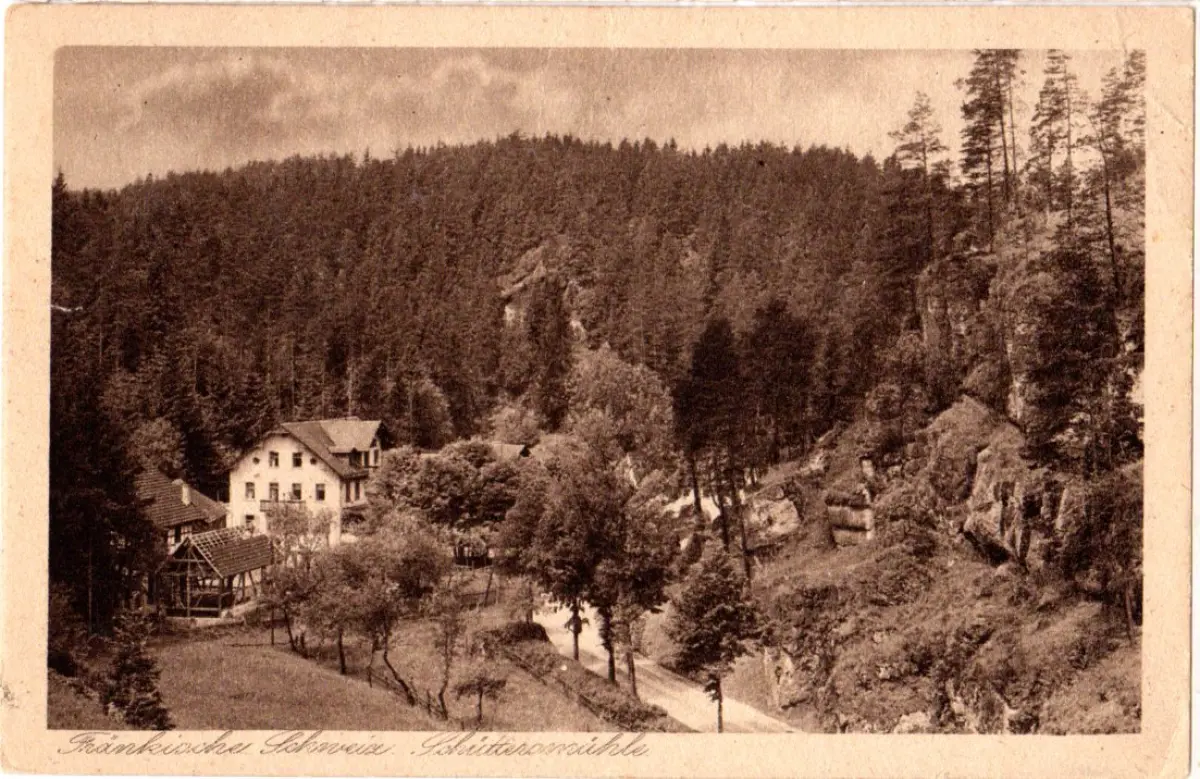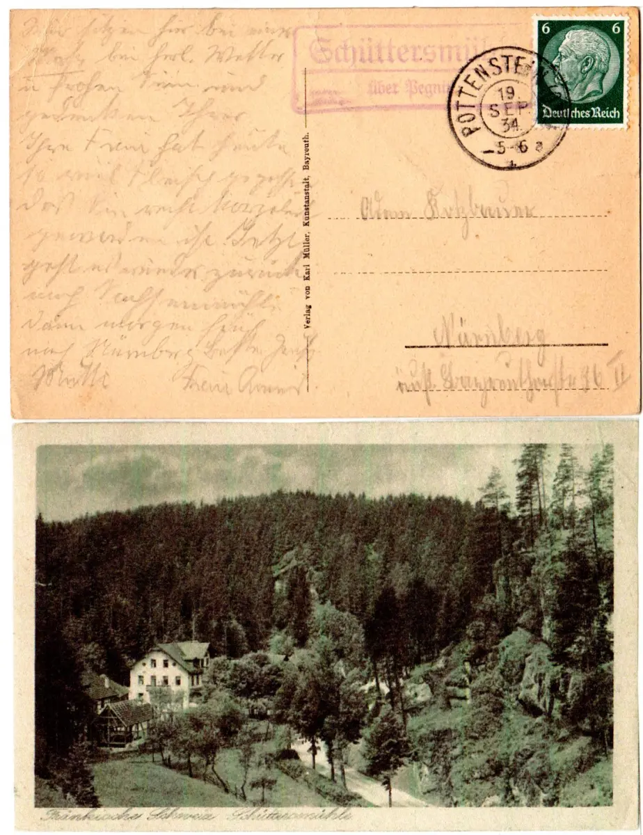 DR 1934, Landpost Stpl. SCHÜTTERSMÜHLE über Pegnitz auf sw-AK m. 6 Pf.