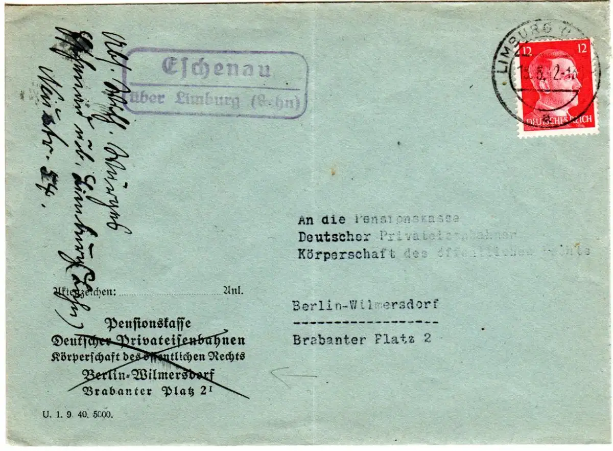 DR 1935, Landpost Stpl. ESCHENAU über Limburg (Lahn) auf Brief m. 12 Pf.