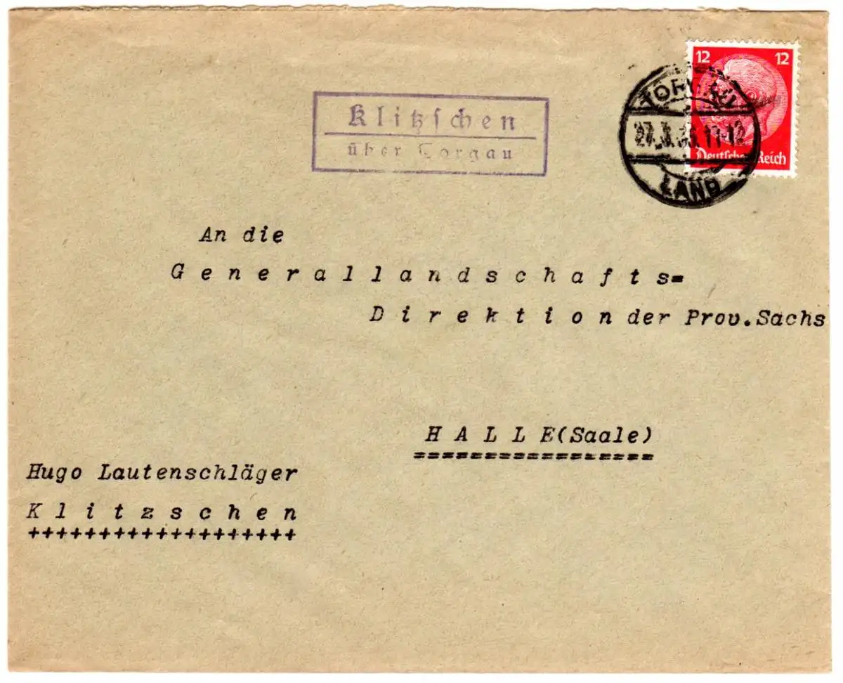 DR 1935, Landpost Stpl. KLITZSCHEN über Torgau auf Brief m. 12 Pf.