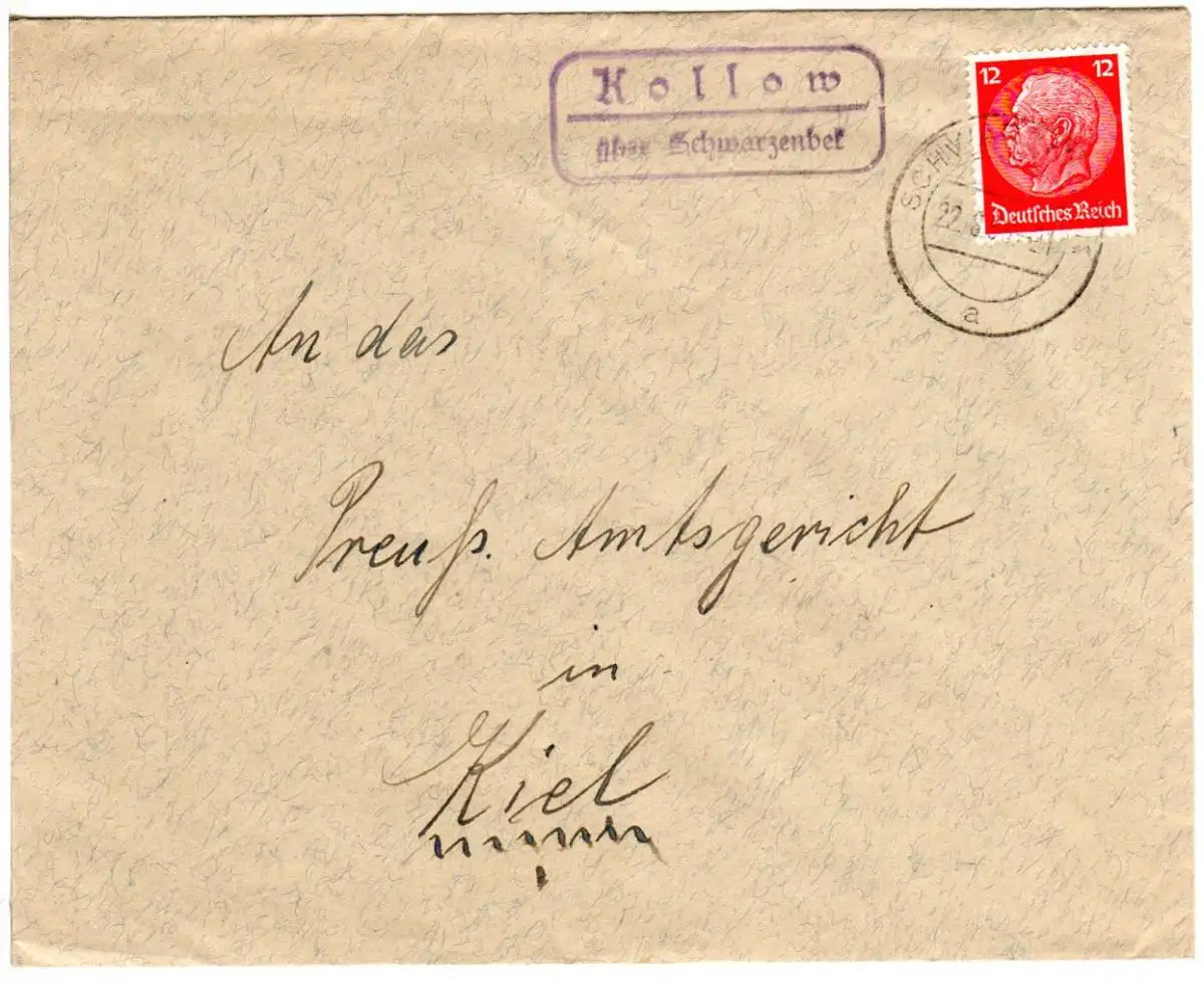 DR 1936, Landpost Stpl. KOLLOW über Schwarzenbek auf Brief m. 12 Pf.
