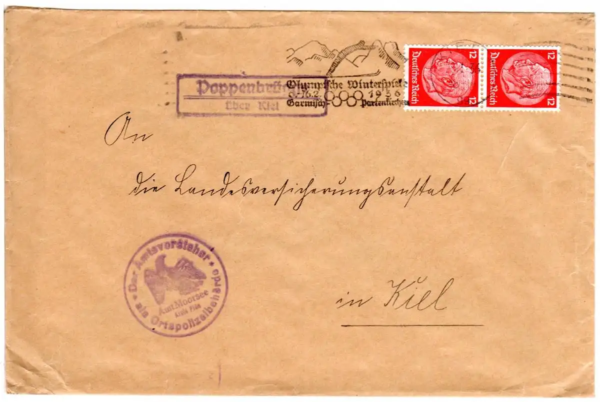 DR 1936, Landpost Stpl. POPPENBRÜGGE über Kiel auf Ortspolizei Brief m. 2x12 Pf