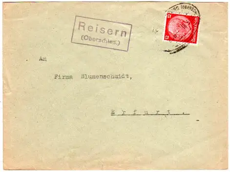 DR 1936, Landpost Stpl. REISERN (Oberschles.) auf Bahnpost Brief m. 12 Pf.