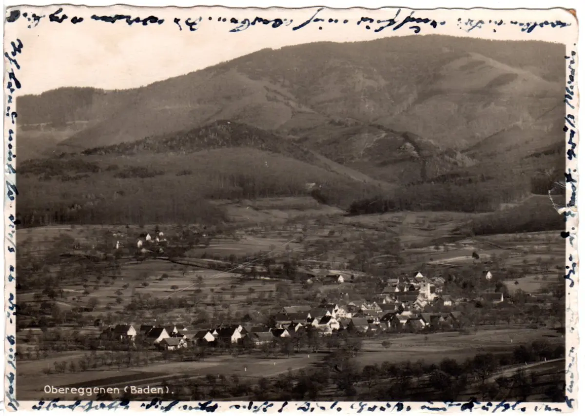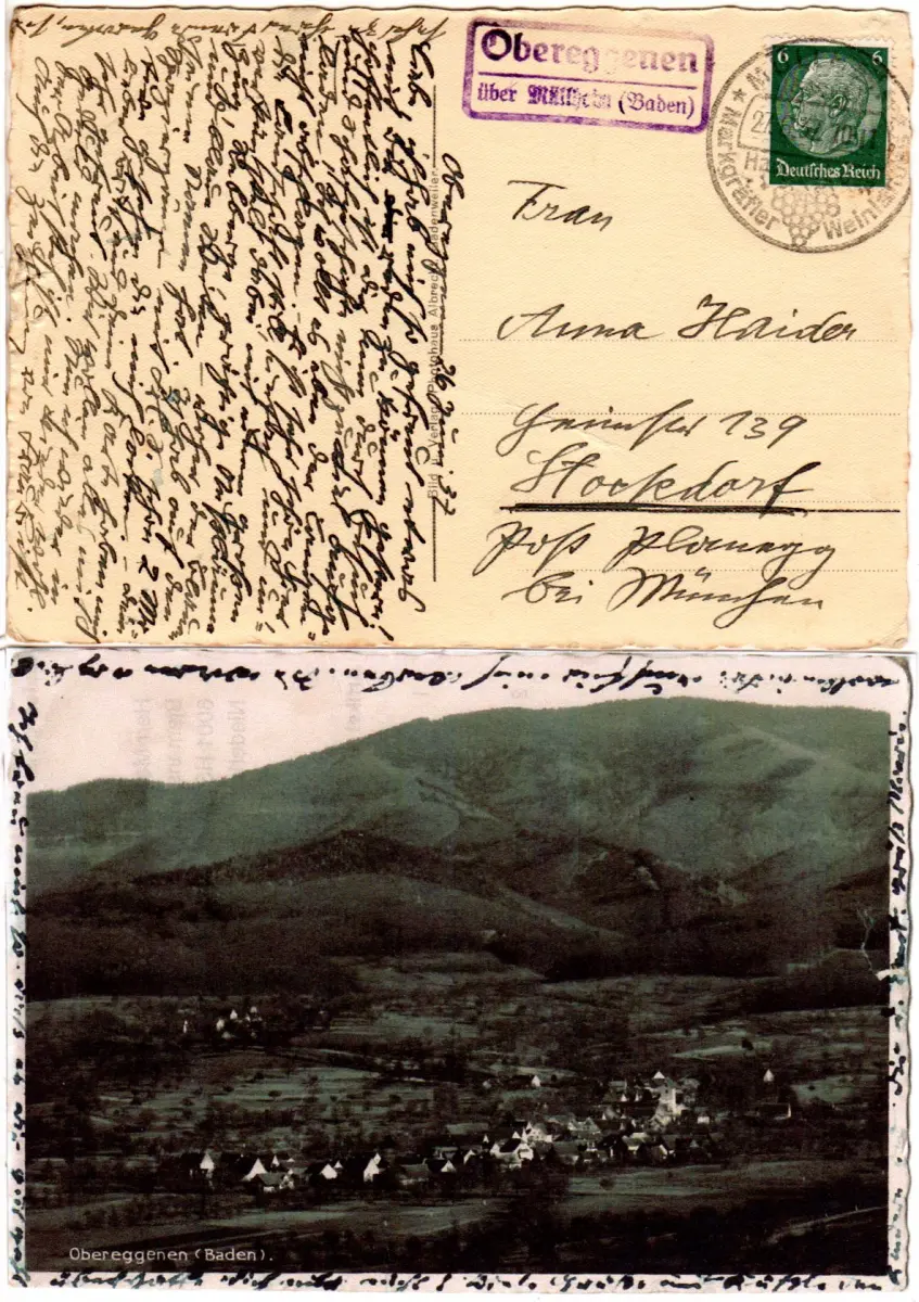 DR 1937, Landpost Stpl. OBEREGGENEN über Müllheim (Baden) auf sw-AK m. 6 Pf.