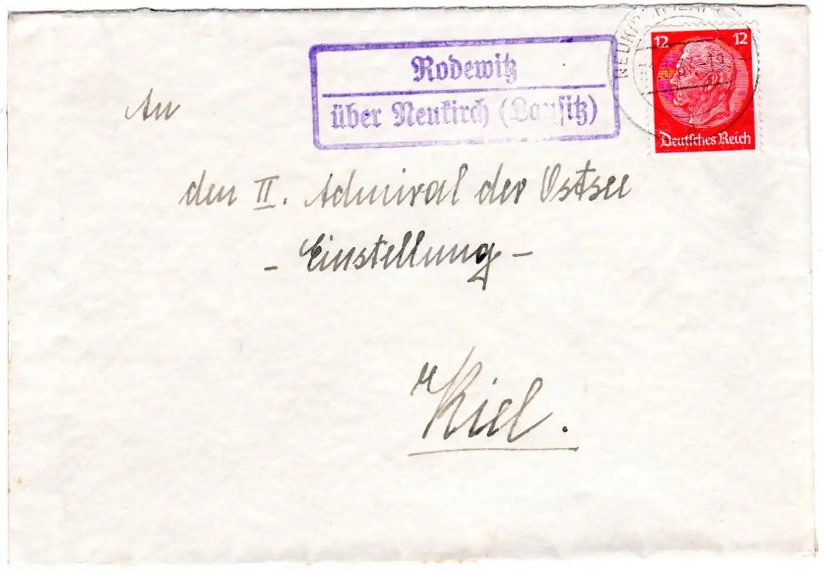Poststellen II -Stempel. Rodewitz/Spree in der Oberlausitz, Ortsteil der Stadt Schirgiswalde-Kirschau im Lkr. Bautzen. Brief an den II. Admiral der Ostsee, Kiel.