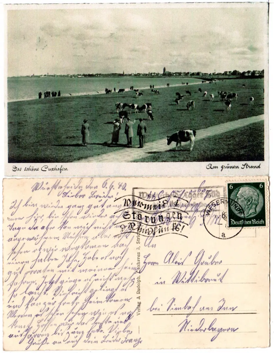 DR 1940, Landpost Stpl. MUNSTERHEIDE LAGER SÜD über Wesermünde auf AK m. 6 Pf.