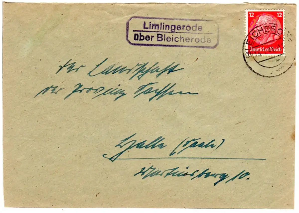 DR 1941, Landpost Stpl. LIMLINGERODE über Bleicherode auf Brief m. 12 Pfg.