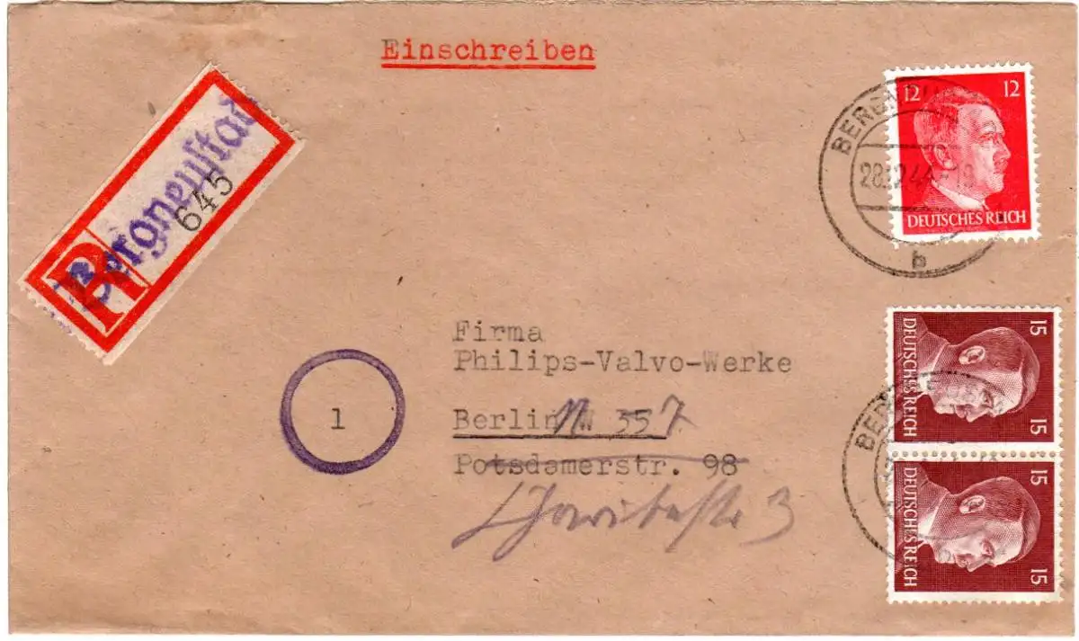 Firmenumschlag E. Leybolds Nachfolger per Einschreiben n. Berlin. Ank.Stpl. rückseitig.
