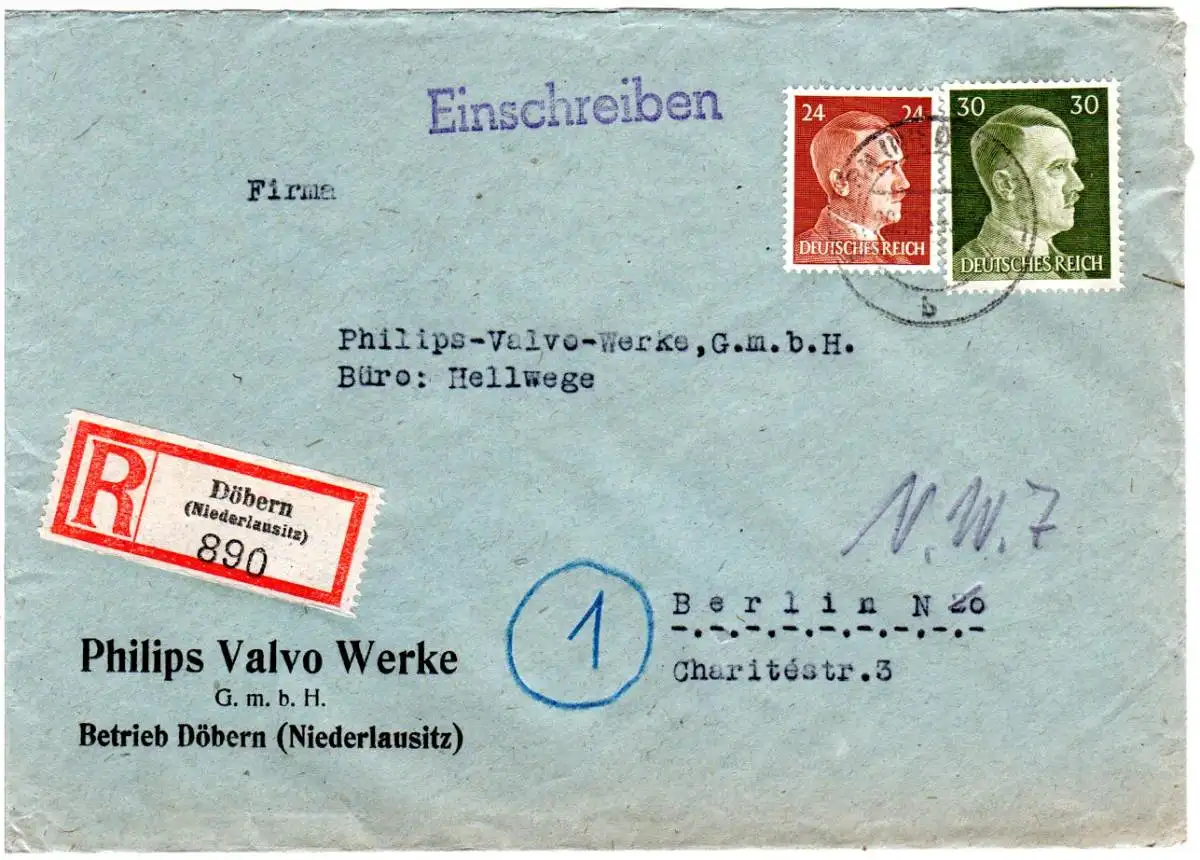 DR 1944, 24+30 Pf. auf Firmen Einschreiben Brief v. Döbern