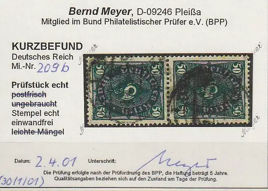 DR/Infla: Nr. 209 in b-Farbe, senkr. Paar, gestempelt, Befund Meyer