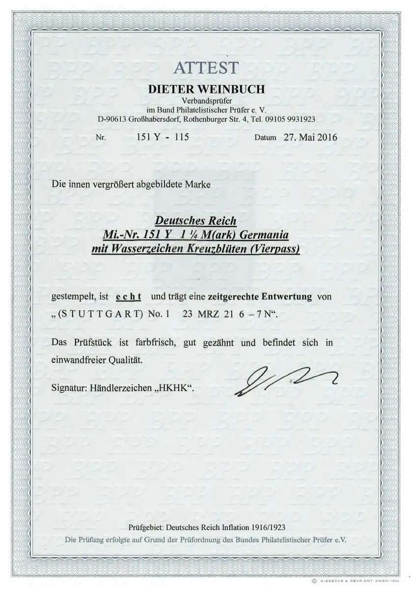DR Min. 151Y (Wz Fleur de croix), cacheté Stuttgart 1921, BPP Attest
