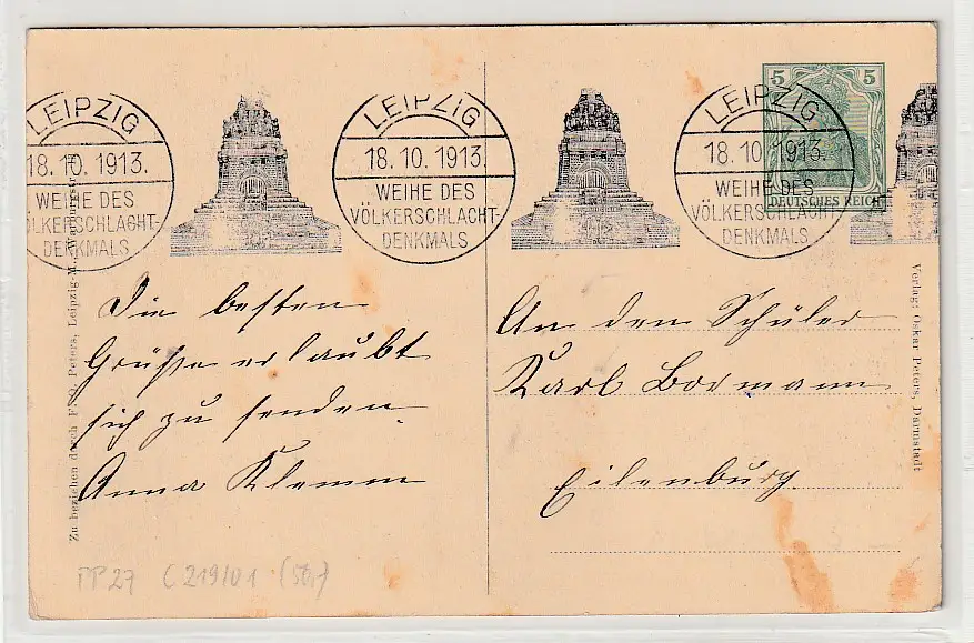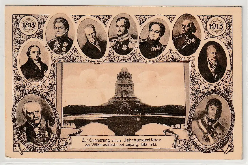 PP anläßlich der Jahrhundertfeier der Völkerschlacht. Bedarfsmäßig gelaufen, mit Sonderstempel. Vorderseitig fleckig, ansonsten einwandfrei (insbes. bildseitig einwandfrei). Katalogwert (Frech-Katalog) 50,00 €