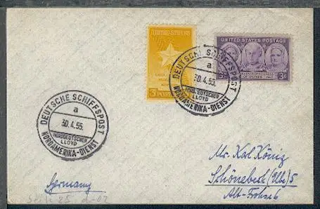 DSP NORDAMERIKA-DIENST a NDL 30.4.55 auf Bf. mit USA-Frankatur