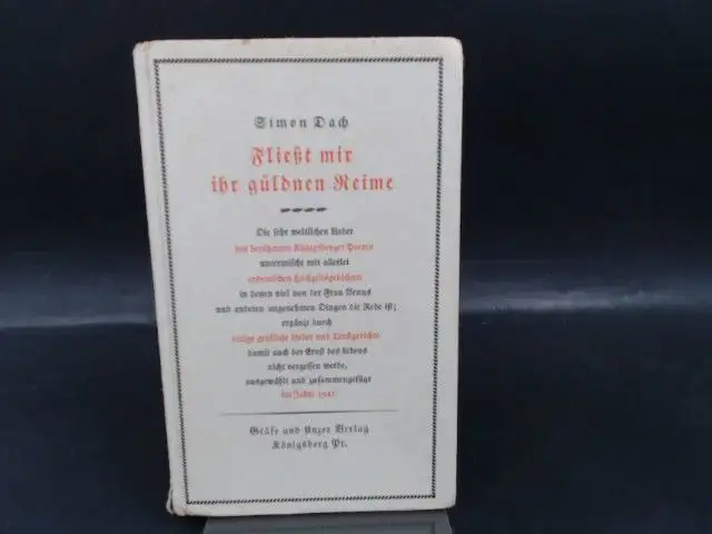 Fließt mir ihr güldnen Reime. Einband teils leicht bestoßen, teils fleckig. Besitzvermerk. Unterer Buchrücken auf einer Länge von ca. 2cm abgelöst. Papier altersgemäß etwas nachgedunkelt, wenige Seiten/Schnitt leicht fleckig. Sonst guter Zustand
