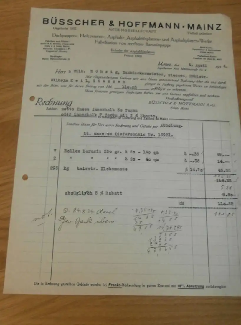 Dachpappen- und Asphalt-Fabrik , Büsscher & Hoffmann in Mainz , 1934 , altes Dokument / Rechnung !!